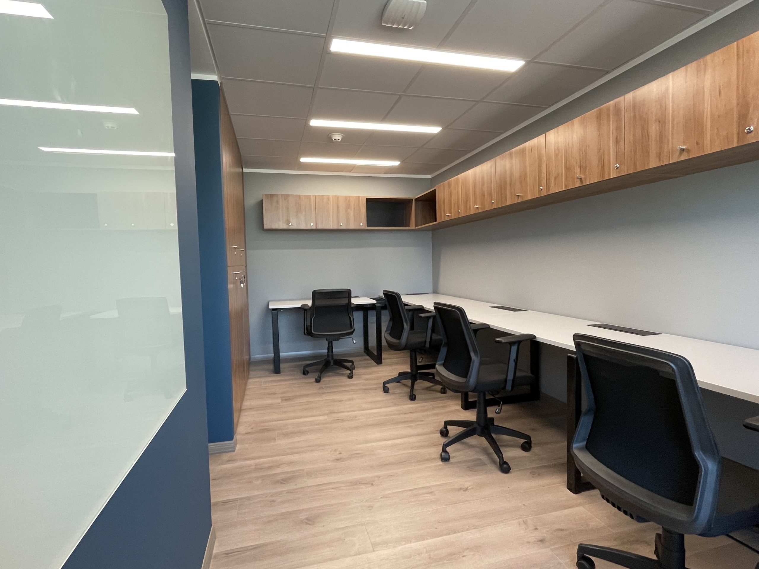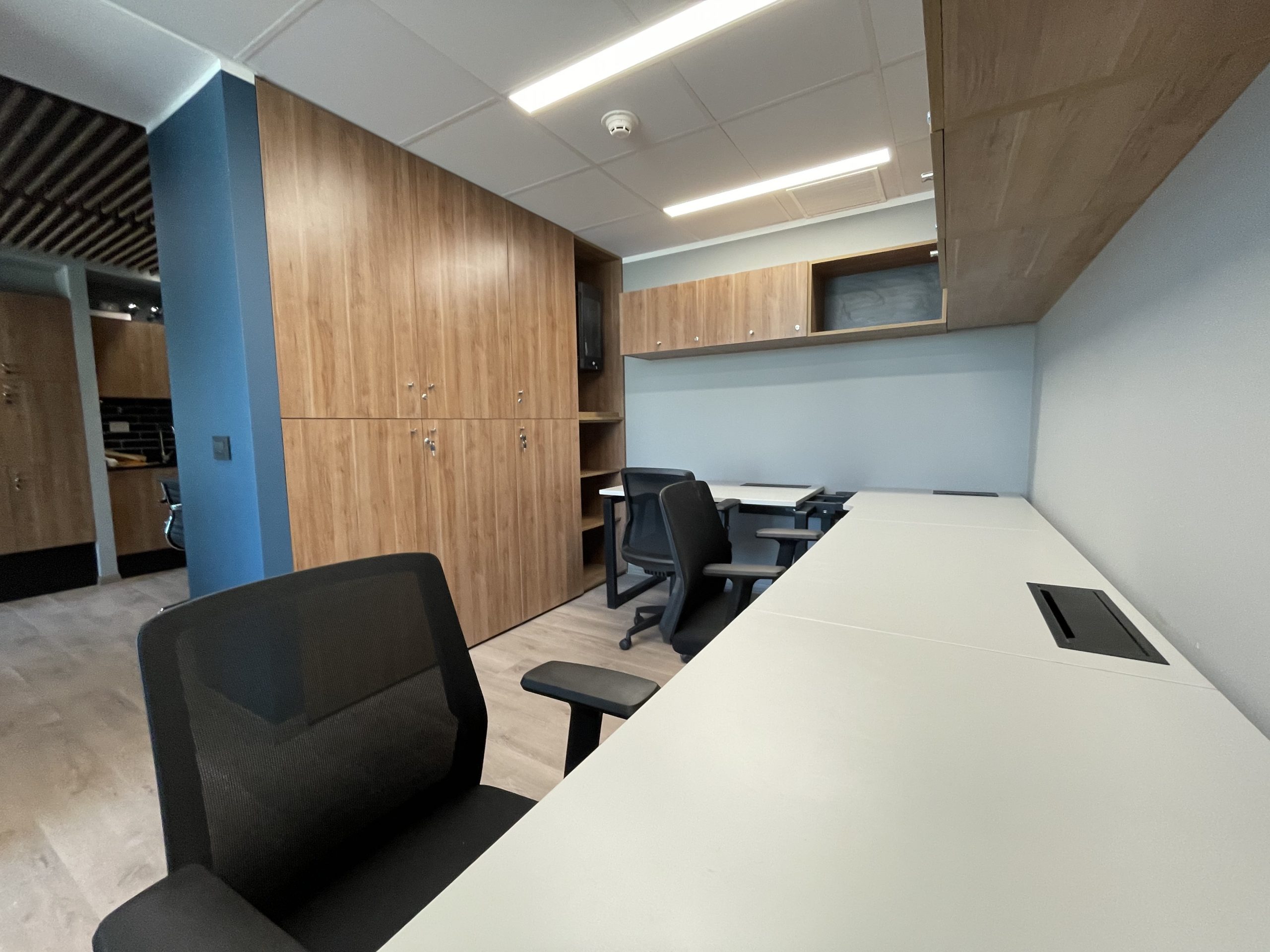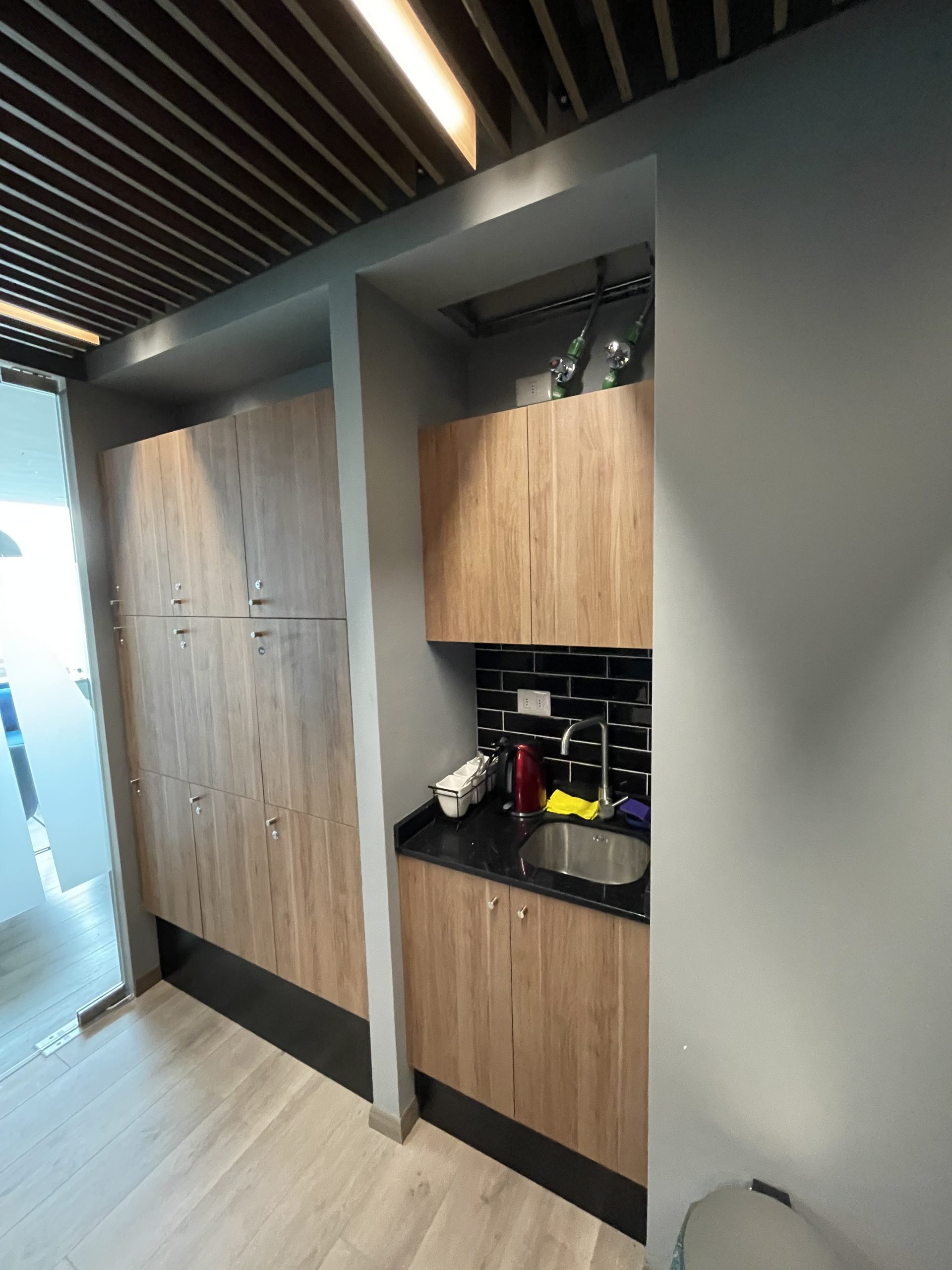 Para M2B se ejecutó una habilitación de planta libre 75m2. Se eficientizó el espacio con un sector de trabajo y una sala de reuniones principal. En el acceso, se dió el desafío de generar otra sala de trabajo, con un coffee corner, almacenamiento y lockers para el personal. Se le dió valor al proyecto con el uso de palijjale en sector acceso, combinandolo con tonos madera en el mobiliario e iluminación atractiva.